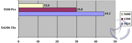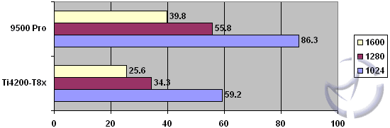 The Inferno benchmark hits video cards a little harder than the Antalus, and as we can see above, the Ti4200 is struggling hard. The 9500 Pro isn't exactly having a ball, but it does maintain playable framerates at 1024, but the higher resolutions and increased AA and AF settings slow things down by 50% from no AA/AF to 6xAA, 16xAF.