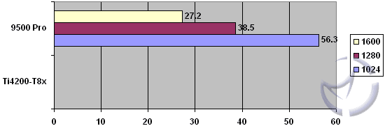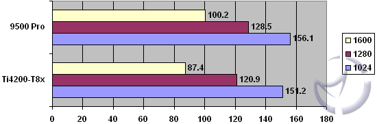 Since there's no point in mentioning the 9500 Pro leading the Ti4200 (again), I will point out some things that I feel would be important to gamers. No AA/AF is something the 9500 Pro can handle with ease. Even at 1600 resolution, you're not going to have many problems. Turning on AA and AF is a different story. In my opinion, you're going to be limited at 1024 resolution if you're going to maintain a 60fps pace. Anything higher creates a large decrease in performance. At 1600x1200, there's a 73% drop from No AA/AF to 6xAA, 16xAF.