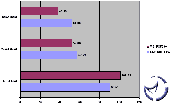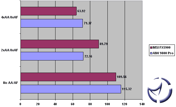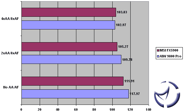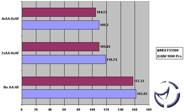 The AIW 9800 Pro maintains a healthy lead over the FX5900 at 1024 resolution. Though I prefer playing at higher resolutions, the majority of online gamers play at lower resolutions to maintain a higher framrate. Even then, 4xAA/8xAF stays above the 100FPS mark.