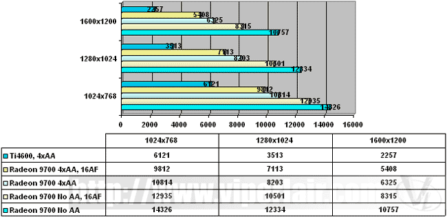 Anisotropic filtering hits the performance pretty hard, though not nearly as much as 4xAA. However, the performance hit isn't terrible, and scoring 10 000+ 3D Marks ar 12x10 with 16xAF is pretty darn impressive. The Ti4600 doesn't fare so well, and it's amazing to see the Radeon, with 4xAA and 16xAF still crush the Ti4600 with only 4xAA.