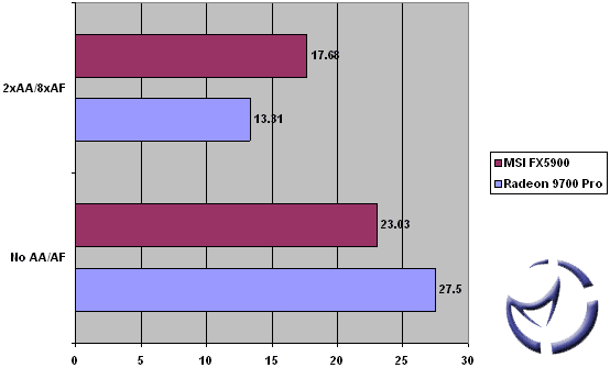 At high frame rates and a lower image quality (no AA and AF that is) the Radeon 9700 Pro outscores the FX5900, but it is dethroned once we throw in some AntiAliasing and Anisotropic filtering.