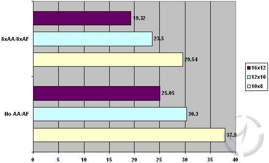 Compared to our stock speed Splinter Cell numbers, we see an increase of about 2 to 3FPS across all the non-AA resolutions, and the 8xAA/8xAF resolutions. Not much of an increase, so we'll leave it up to you if it's worth the risk in OCing.