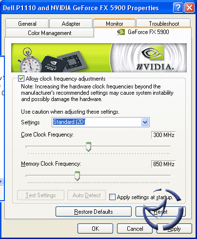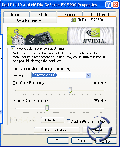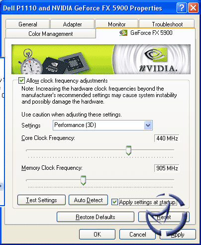 An interesting thing about the FX5900 is there are two clock speeds. 2D speeds are 300MHz Core/850MHz Memory, while the 3D speed is bumped up to 400/850. There isn't really much point in overclocking the 2D, so concentrating on the 3D, we managed a final overclock of 440/905.