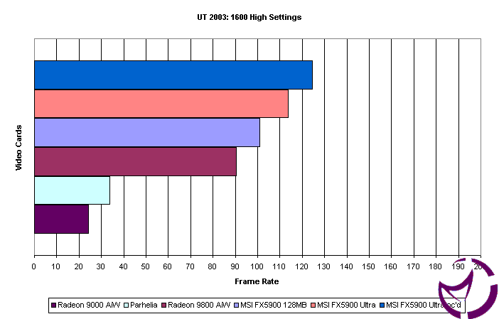 Here we see a bit of a discrepancy between the two systems. The other test system, with the FX5900 and the 9800 Pro performs better in this CPU limited test, at least it is for most of the cards. Clock speed of the FX5900 series means nothing in this test as the overclocked version is only as fast as the stock clocked version of the card. The Parhelia and the Radeon 9000 don't fair as well in this test, but the Parhelia still offers frame rates over 60fps even at a minimum so that is still playable in most peoples books. What about adding AA and ansio as usual?