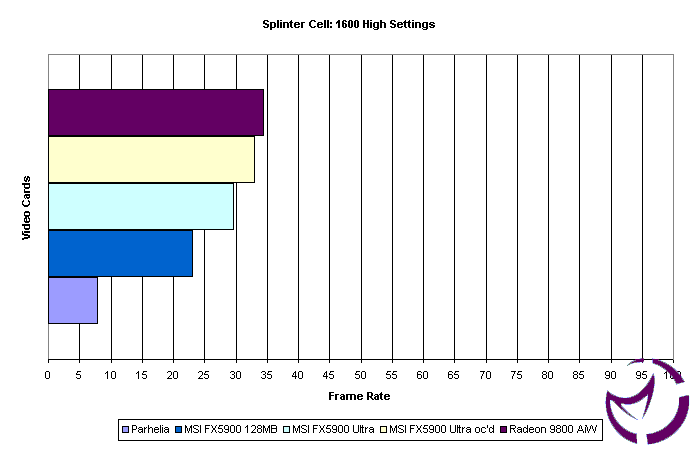 We see that the results here are lower than 60fps, but this game isn't about extremely high frame rates. What we can see here is that the Radeon 9800 bests the FX5900 Ultra only when the Ultra is at its stock settings. When overclocked the FX5900 Ultra beats the Radeon by 5% or 2fps. The overclocking of the FX5900 Ultra nets you a 11% improvement in frame rate. The Parhelia doesn't do that well in this test, performing about 1/3rd as well as the 5900 Ultra.