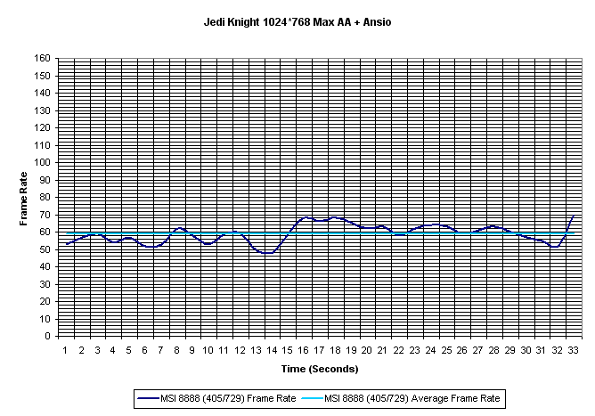 We see the same type of results as we saw at 1600*1200 in Jedi Knight II. Here when overclocked, the MSI card is able to beat the Parhelia in this test. We note a small point as when overclocked and also with the Parhelia the minimum frame rate is slower than that at stock settings, which is most likely a small glitch in the benchmark test. We see a rather large jump in frame rates in this game, but still we see the overclocked MSI card do very well in this setting. What about when enabling AA and ansiotropic filtering.