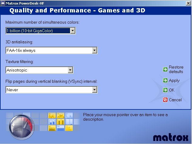 The drivers are very good, but sadly there are no Win 98SE/ME drivers planned. There are however Linux drivers out and in fact Matrox has released 2D drivers only a couple months after the release of the card itself. The Powerdesk software uses the .NET framework which seems to take up a fair amount of system RAM. All in all the drivers are very nice and well laid out, with most options being just a click or two away.